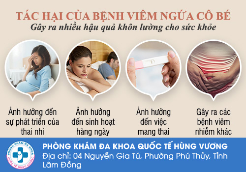 Gây ra các bệnh viêm nhiễm khác: Viêm âm đạo nếu không kịp thời điều trị dễ dẫn đến các bệnh viêm nhiễm khác như: viêm đường tiết niệu, viêm vùng chậu, viêm niêm mạc tử cung. Bên cạnh đó, khi da hoặc niêm mạc trực tiếp hoặc gián tiếp tiếp xúc với mầm bệnh dễ lây nhiễm các bệnh lây truyền qua đường tình dục như: mụn rộp sinh dục, bệnh lậu, giang mai, nấm…